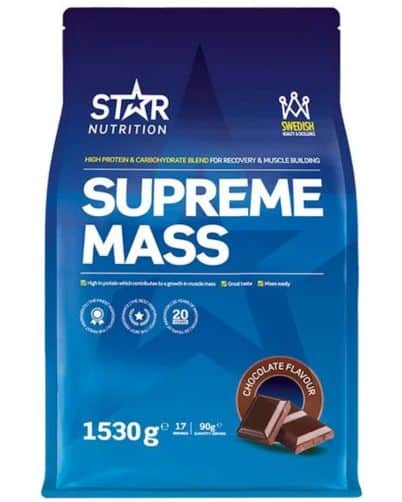 Supreme Mass fra Star Nutrition er en populær gainer i Norden. Den kombinerer valleproteinkoncentrat og maltodextrin og giver en god balance af hurtige kulhydrater og protein af høj værdi. Ønsker du at tage på i vægt, kan Supreme Mass øge dit kalorieindtag uden fyldstoffer. Det gør den til et kvalitetsprodukt. Den fås i flere smagsvarianter, som både smager godt og er nemme at blande. Det gør den praktisk som mellemmåltid eller efter træning.
